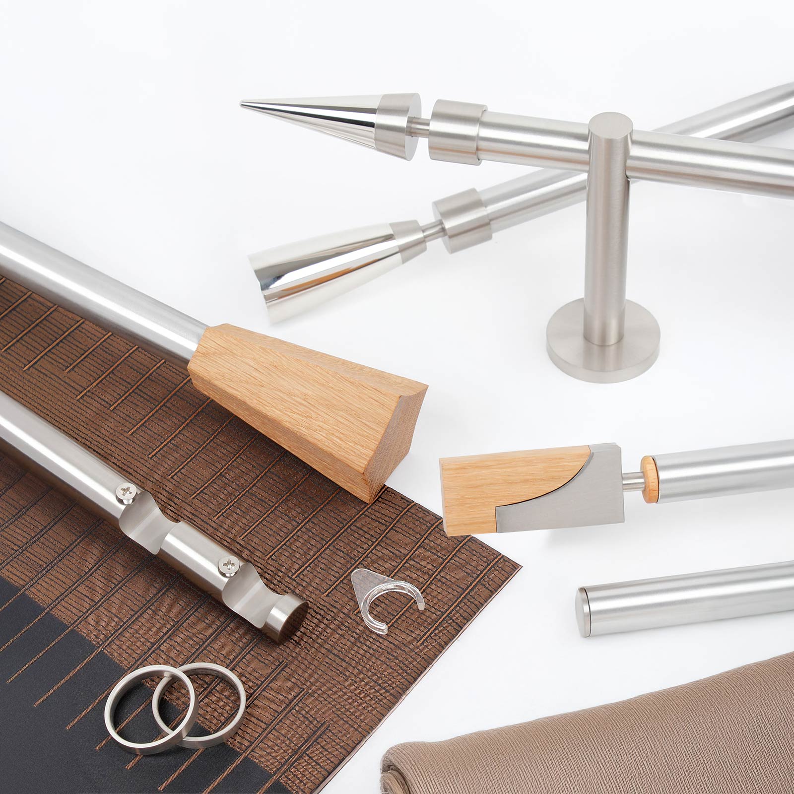 Stilgarnitur mit V2A Rohr ø 20mm, Träger 10cm offen mit Anschraubplatte, Ringe flach ohne Einlage mit Faltenlegehaken und verschiedene Endstücke