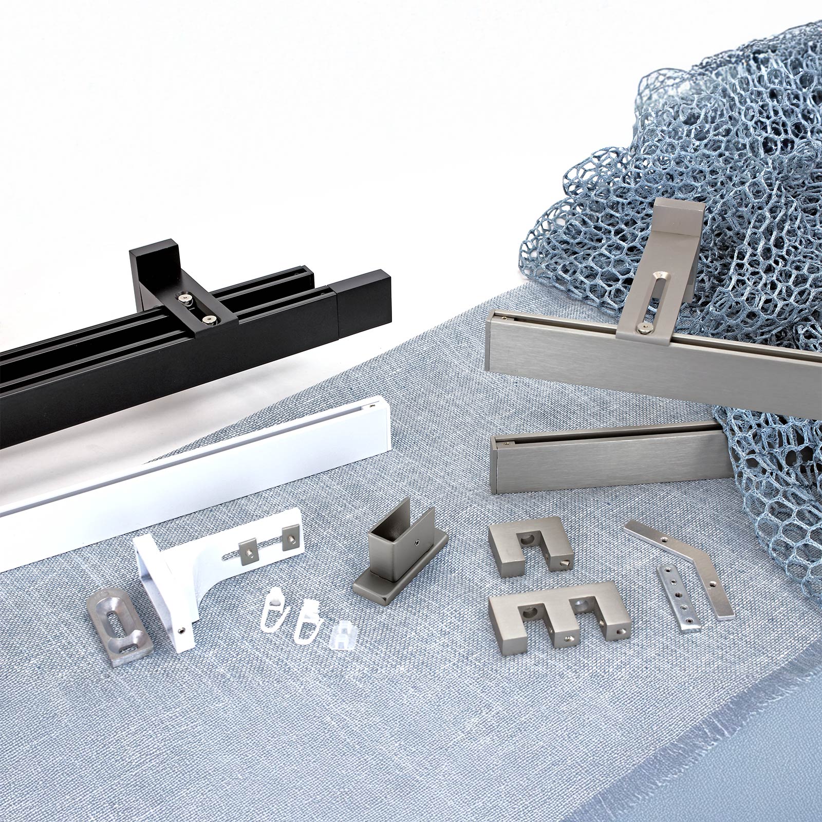 Hochkant Innenlaufgarnitur aus lackiertem Aluminium und Zubehör Satin Nickel, die Endstücke ebenfalls aus Aluminium