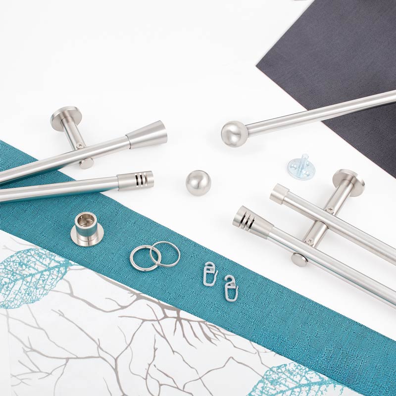 Stilgarnitur in Edelstahl-Optik, das Metallrohr mit 16mm Durchmesser ist mit Edelstahl ummantelt. Die Endtücke sind aus Edelstahl V2A oder gebürsteten Stahl, die Träger sind aus gebürstet Stahl.