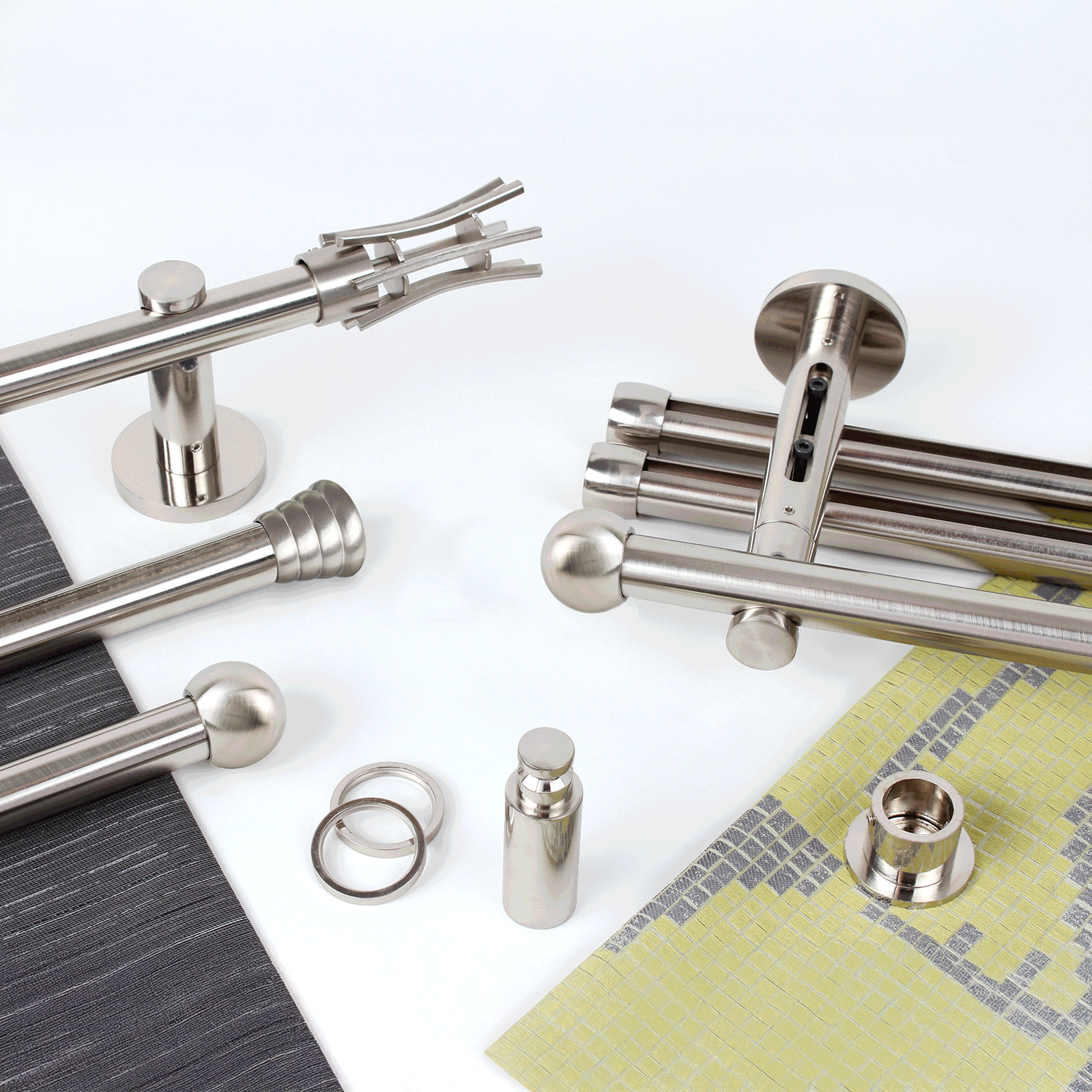 Die Stilgarnitur besteht aus einem 20mm Alu-Innenlauf Rohr und einem kurzen Träger oder Doppelträger. Sie kann als Innenlaufgarnitur mit Gleitern oder als Stange mit farblich passenden Gardinenringen verwendet werden.