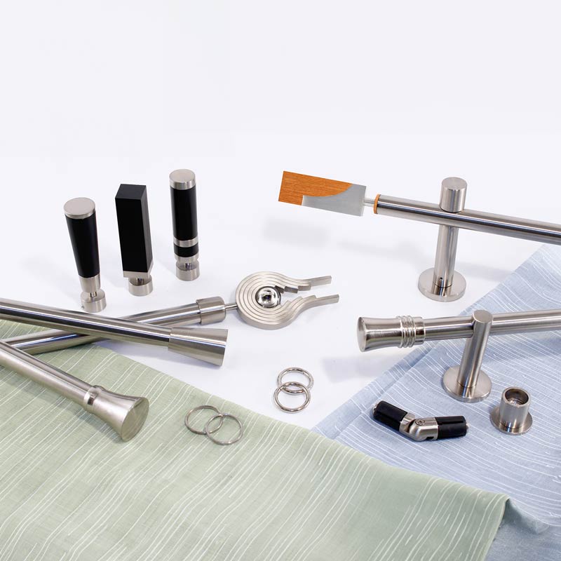 Die Endtücke sind aus Edelstahl oder mattem Nickel in Kombination mit Schwarz oder Eiche. Für die Befestigung gibt es offene Wandträger oder Schraubkappenträger.