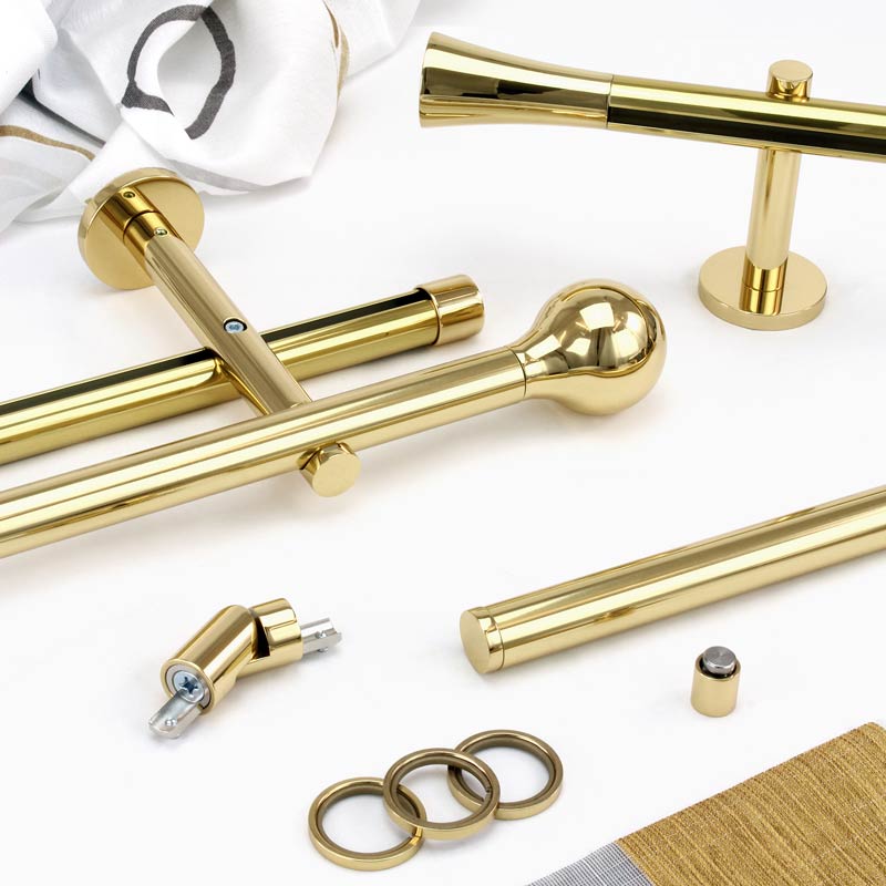 Stilgarnitur in Messing glanz, Rohr und Innlaufprofil mit ø 20mm, offene Träger mit Anschraubplatte. Bei Innenlaufgarnituren mit Klickgleiter, bei Rohr Ringe mit Gleiteinlage und Faltenlegehaken. Die Endstücke sind aus Messing gefertigt.