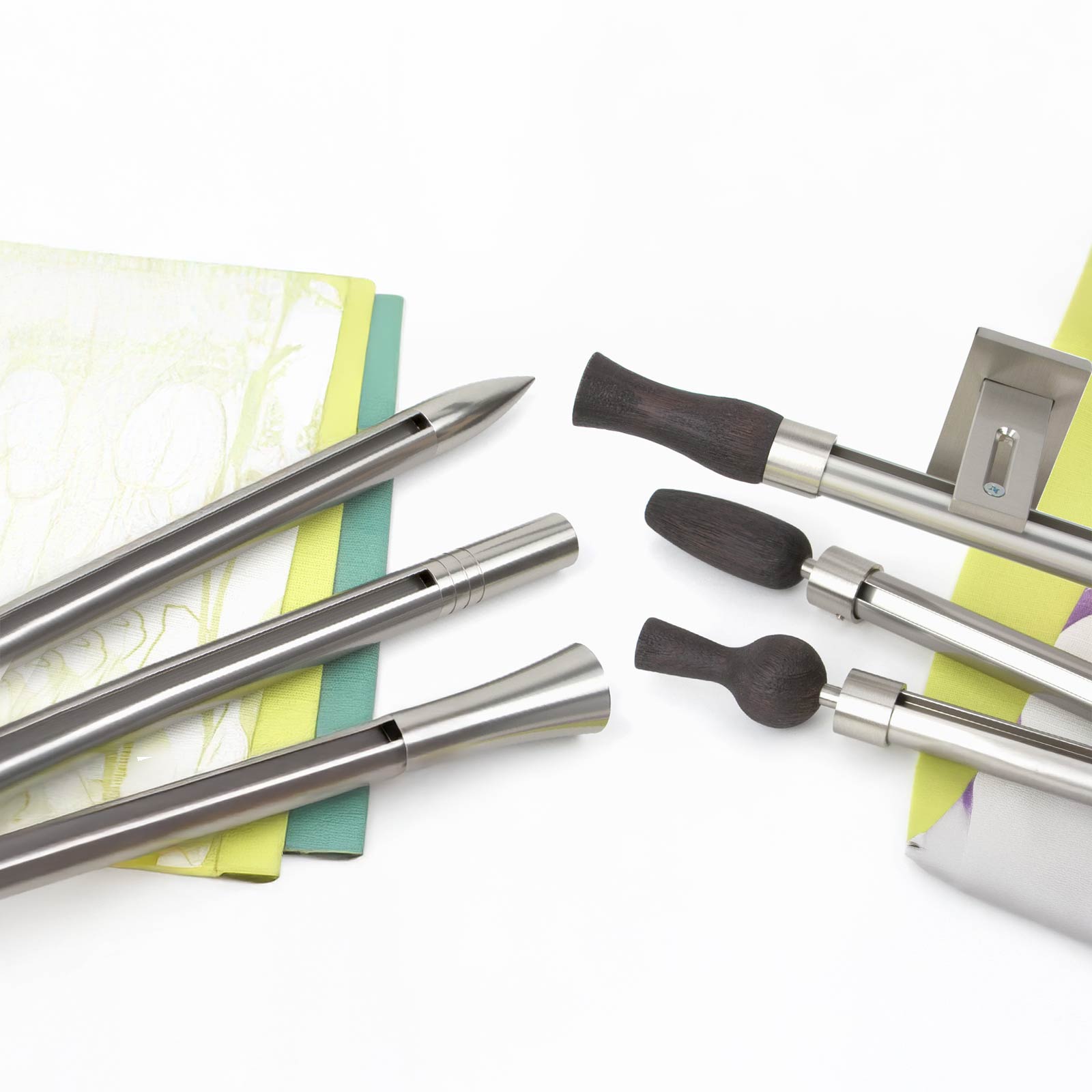Stilgarnitur als Flächenvorhangsystem, Profil rund ø 20mm, Träger 4-7cm, Klick-Gleiter und Feststeller, mit verschiedenen Endstücken aus Metall